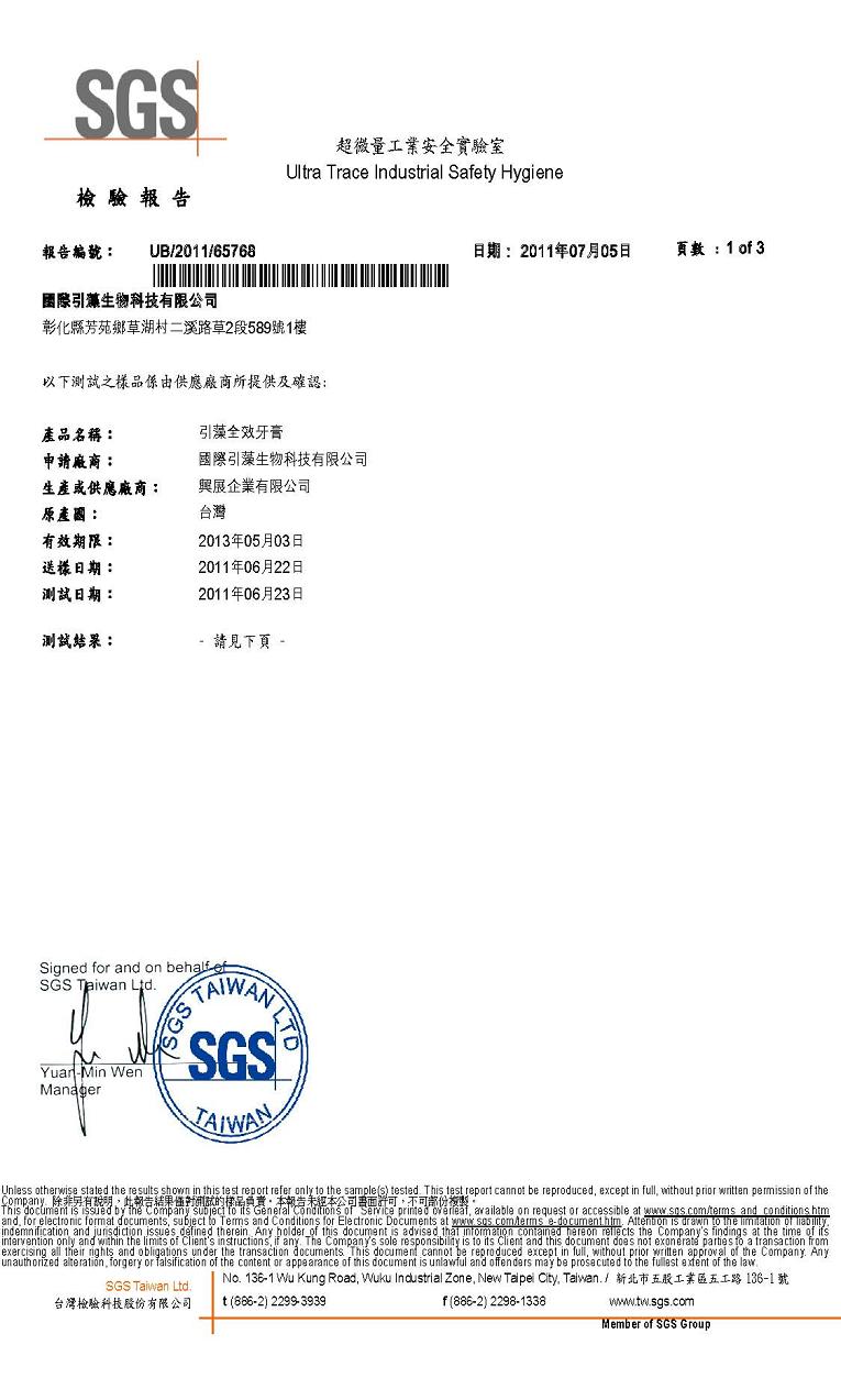 引藻全效牙膏檢驗報告